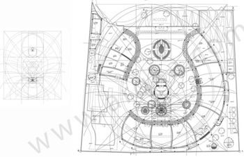 A partir de dos espirales áureas contrarotatorias se dispusieron las áreas del proyecto que van desde los salones hasta una cocina-restaurant. Se calculó en base a las plantillas geometricas ármonicas que dan fuerza a los dueños y a los usuarios del lugar la altura, anchos, largos y dimensiones ideales de la construcción.