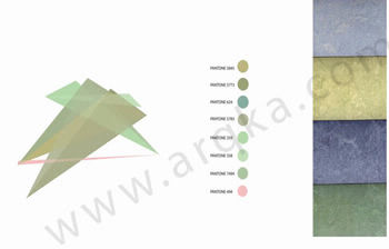 Transformamos estas plantillas geométricas por referencias angulares de longitud de onda y obtuvimos la gama de colores a utilizar en el espacio. La exacta matemática y enlace entre la forma, el lugar, los colores y los sonidos: una conjunción heterodinámica de ondas que generan un punto de gravedad.