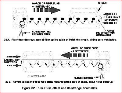 The extraordinary thing is that, even after the fiber fuse runs (at about a meter per second) the length of a fiber optics cable and "destroys" it (even for many, many kilometers), the physical damage - holes blown in the core about every centimeter or so - can often be reversed by simply reversing the laser light direction down the cable and re-initiating the fiber fuse from the other end.