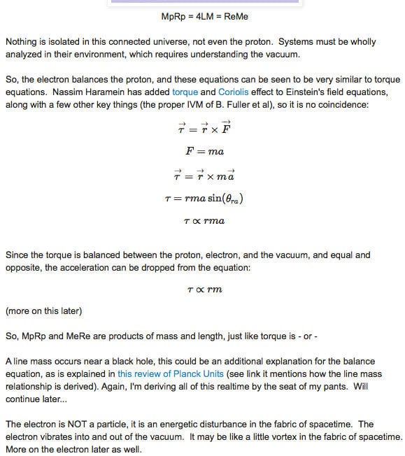 replied to elizabeth rauscher: " Dan, I do not recall Nassim's latest theory claiming a strong force. As a matter of fact, no strong force is needed. Nassim's theory already proves that. The fact that these 3 magic numbers REQUIRE Nassim's proton mass.radius product equation (MpRp=4LM) to be correct means Nassim's theory IS correct. The main point I am making, is Nassim’s proton solution is REQUIRED to be correct to be able to solve for the 3 magic numbers: the proton/electron mass ratio, Planck mass to electron mass ratio, and Planck mass to proton ratio. Nassim’s proton radius solution is correct, it gives the three magic numbers. I think if Elizabeth saw Nassim’s whole solution and that it agrees with a whole simultaneous solution to a set of 2 Schrodinger equations – simultaneously solving for the proton and electron masses and focusing on the ratio of this mass and the other appropriate number of mass ratios (the Planck mass to the electron mass, and the Planck mass to the proton mass). It is using a simultaneous set of equations solution to solve for the magic numbers. This is something I derived mathematically, privately many years ago and solved for the 2 key pieces of information, either one of which, being the proton or electron radius COMBINED with Lyz Starwalker’s reasoning for equating the two, a reason Nassim easily sees.