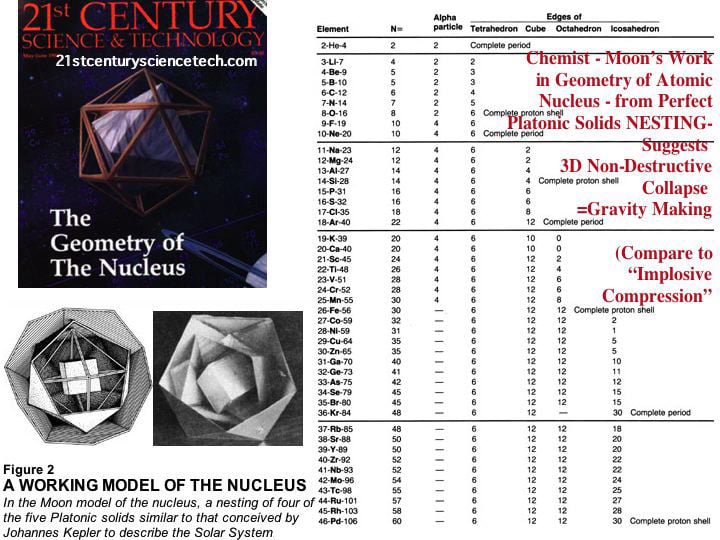 below- note the NUCLEAR HADRONS (proton + neutrons) are ALSO platonically arranged.( see Moon / Univ Chicago pic, 21st Century Magazine).