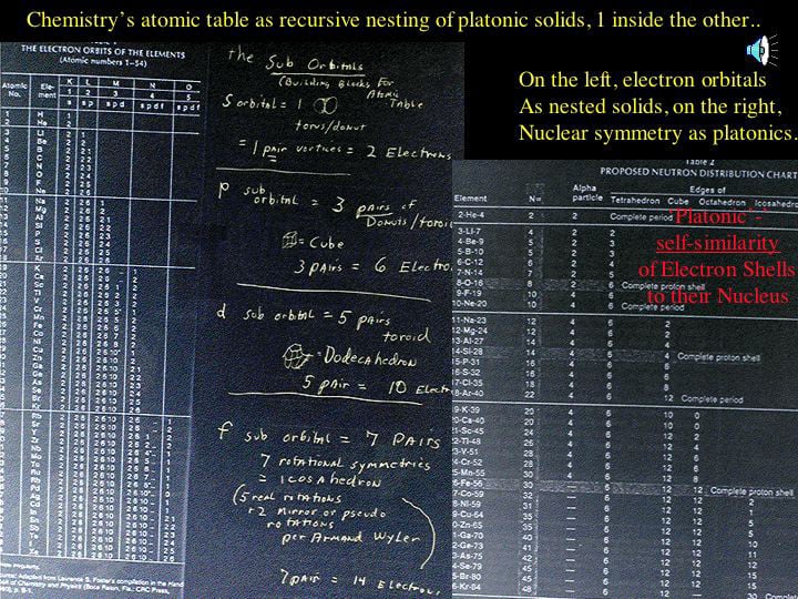 Visually showing how self- similar/ fractal (golden ratio / conjugate) charge collapse creates the atomic table- is illustrated by the fractal relation of electron shell symmetries to the nucleus. Specifically- we see that all electron shell symmetry (s,p,d,f sub-orbitals)- is essential S- TOROIDAL, P-TETRA/CUBIC, and D-F being dodec/icos: