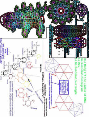 (Abajo, Izq) un peldaño de la escalera del pentagrama de Proporción Dorada del ADN, al Hexágono, al Rectángulo Dorado.