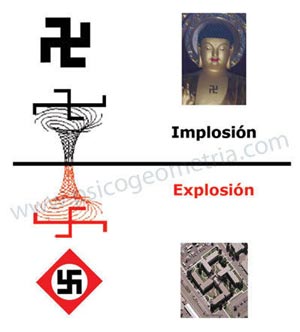 Si consideramos los opuestos que se unen para poder funcionar, recordemos que tenemos un lado implosivo y otro explosivo en el toroide y, para que existan, se tienen que permitir a uno implotar y al otro explotar. El lado explosivo es cuando la energía/materia va del punto cero hacia el exterior, cuando se ve atraído hacia el norte, pero con polaridad sur. Tiene distintas asociaciones semánticas, todas ellas referidas al mismo proceso de explosión: es el yang, lo masculino, es desenvolvente, es lo positivo, se mueve realizando un levogiro (gira en contra de la manecillas del reloj), tiene el poder de la separación, genera calor y es la suástica que va hacia la izquierda. También está asociado a la raza “adámica”, al color rojo y a la fuerza eléctrica. Considerado como un movimiento que busca llevar la Tierra al Cielo, la materia a la energía, busca la libertad, el caos, el rompimiento del orden, busca generar muerte y transformación. Para un ser humano el movimiento explosivo es la conquista material.