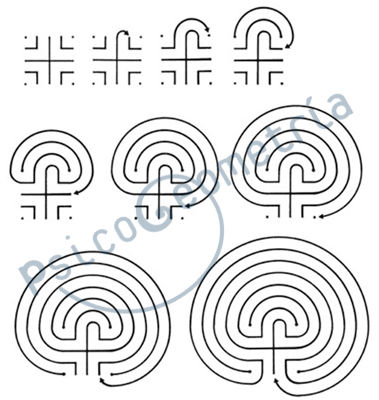 4. el último trazo empieza en el brazo inferior de la cruz central. La entrada al laberinto culmina