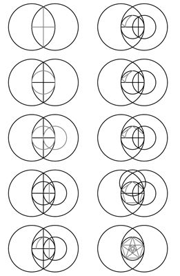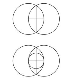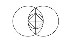 A partir de la vesica piscis dibuja las líneas vertical y horizontal. Con el compás apoyado en el centro del cruce de ambas líneas y radio al centro de los círculos grandes traza el ciruclo pequeño. Conecta los cuatro puntos del trazo y fractaliza el dibujo uniendo los puntos medios de cada línea.