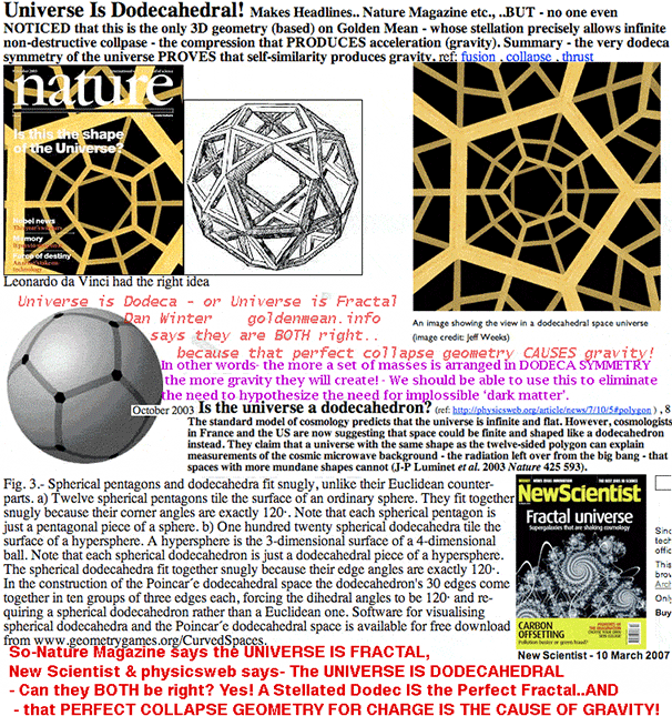 Updating Physics evidence- Dan Winter's Phase Conjugate Fractal theory of gravity- predicts the physics literature is likely mistaken for inventing 'dark matter' merely because they could not account for more gravity in the universe than it's mass required- BECAUSE physics is unaware the ARRANGEMENT (conjugate symmetries)- of the mass- would increase the AMOUNT of gravity (per Winter's model)- YET much evidence shows the arrangement of mass in the universe (like in the Earth)- is dominantly (golden ratio conjugate) DODECAHEDRAL! - New physics article- may support this: What If Dark Matter Were Actually A Vast Electric Field?