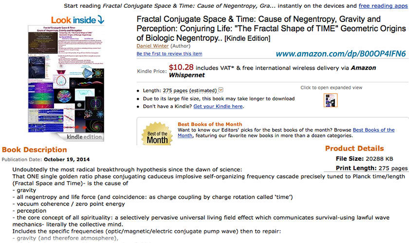 Dan Winter’s new book presents the most compelling and systematic scientific evidence to date – that fractality in space and time is the specific mechanism and cause of gravity, biologic negentropy, life force, perception, and human bliss. Although several hugely famous authors have already presented their books on fractality in time- by comparison – this book shows they were functionally clueless about the physics. Winter quotes many scientists who have already speculated that fractality is the cause of gravity- BUT Winter is the first to very specifically define the frequency, geometry, and wave mechanic optimization of that gravity causing fractality.