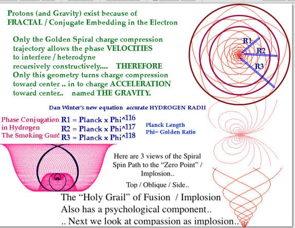If now for the first time- the phase conjugate charge arc- (THE GRAVITY) which (fractally) EMBEDS the proton within the electron - is now proven- Dan Winter's fractal conjugate cause of gravity cannot be refuted. In the case of hydrogen- Dan Winter's new equation has proved that spacing of electron shells-to the Planck center- is precisely integer golden ratio exponents (PHASE CONJUGATE..) of Planck length.