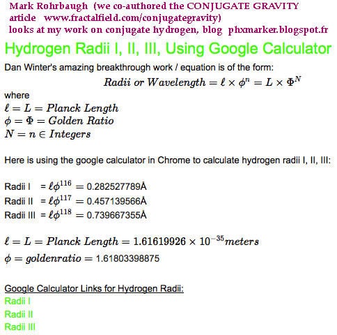 Mark Rohrbaugh (we co-authored this CONJUGATE GRAVITY article below- looks at my work on conjugate hydrogen- today- nice google calculator link to confirm my discovery: hydrogen's radii EXIST BECAUSE THEY ARE A NEGENTROPIC (golden ratio ) PHASE CONJUGATE PUMP WAVE ( I have shown this is also true of Photosynthesis, of Earth's Schumann Harmonics, of the Brainwaves and Spine Pump of human bliss .. and much more www.fractalfield.com/conjugateperception