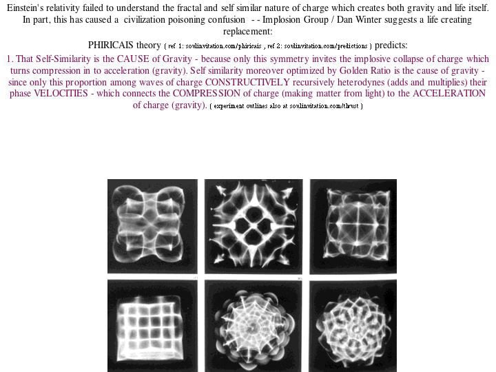 short prolog: NOW THAT WE KNOW (Phi optimized, Implosive, & Phase Conjugate) FRACTAL ELECTRIC FIELDS ARE THE CAUSE OF ALL SELF ORGANIZATION, GRAVITY, PERCEPTION, CONSCIOUSNESS, HEALING, LIFE, (nouishment, education, symbol..) and ONLY way out of CHAOS..into ANY SUSTAINABILITY... ( goldenmean.info/fractalfield )